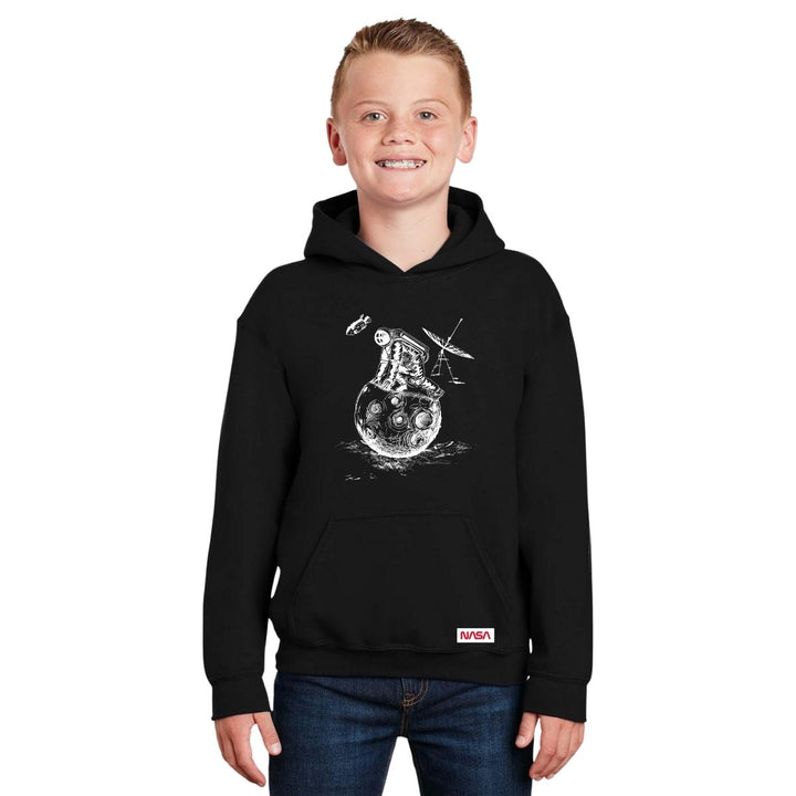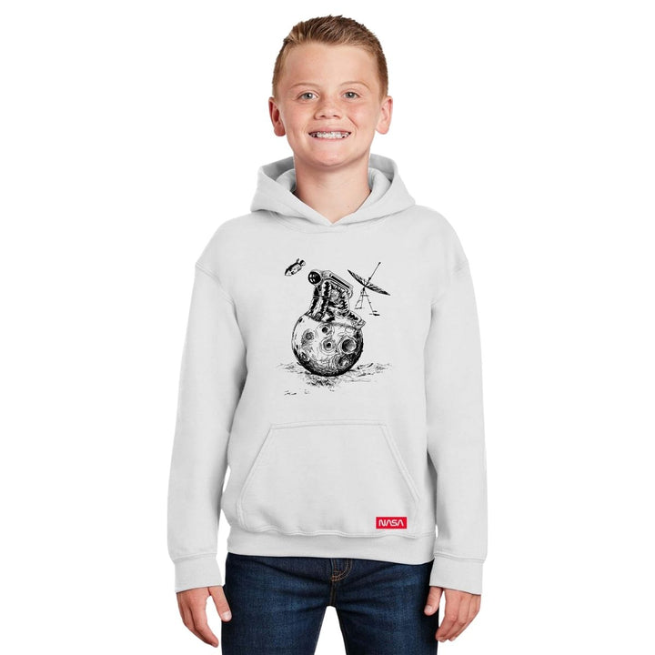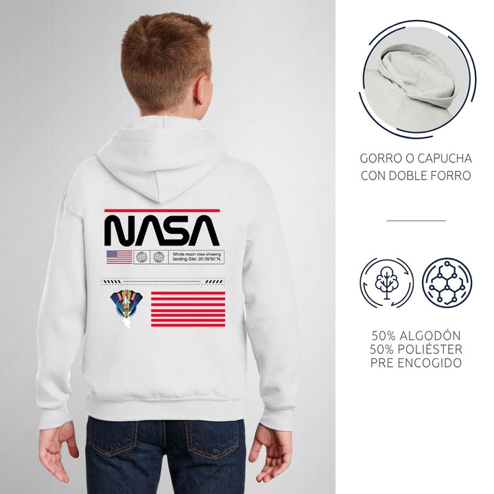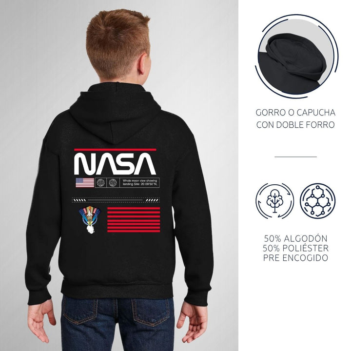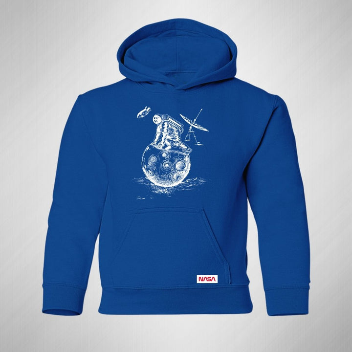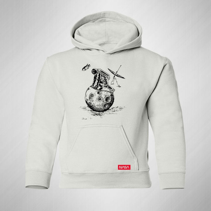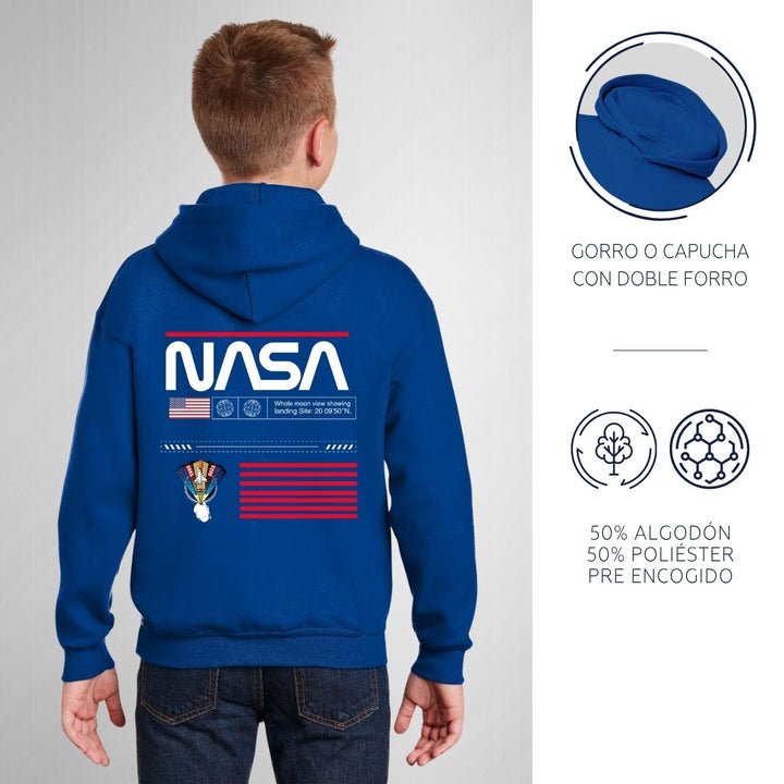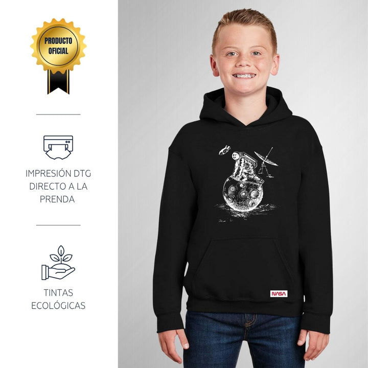 Sudadera hoodie infantil con gorro o capucha y bolsillo frontal canguro nueva, para niño o niña, diseño Luna original impreso con tecnología DTG (directo a la prenda) tacto cero, uso casual o deportiva, 50% algodón y 50% poliéster fleece pre encogido, estructura tubular con ajuste clásico. Colores de sudadera: Azul Rey, Negro, Blanco.