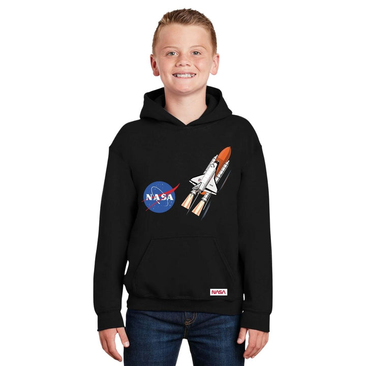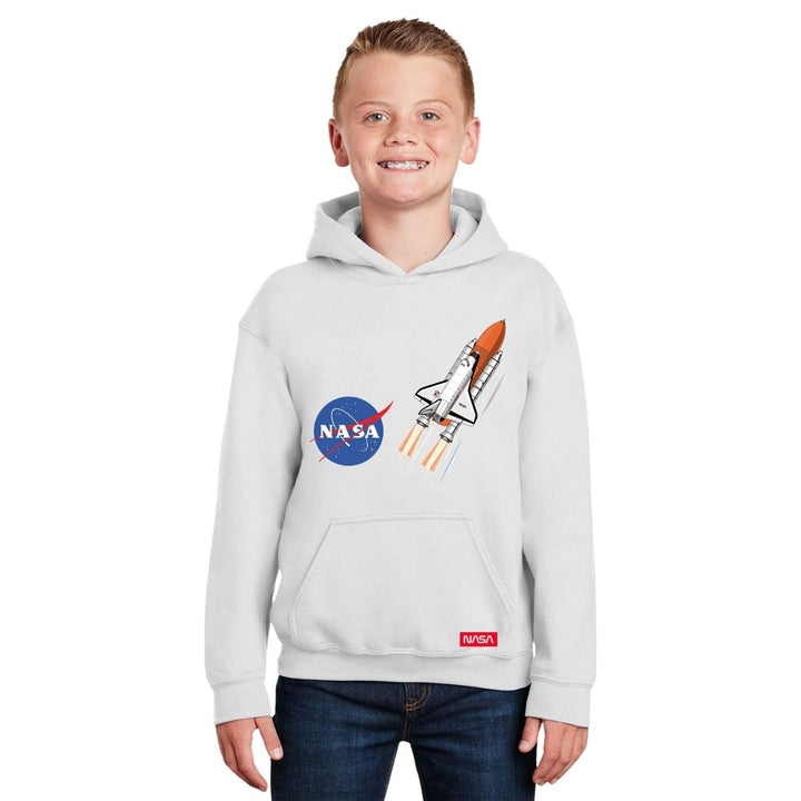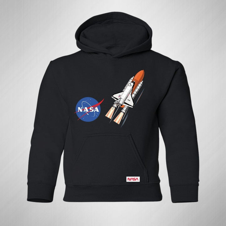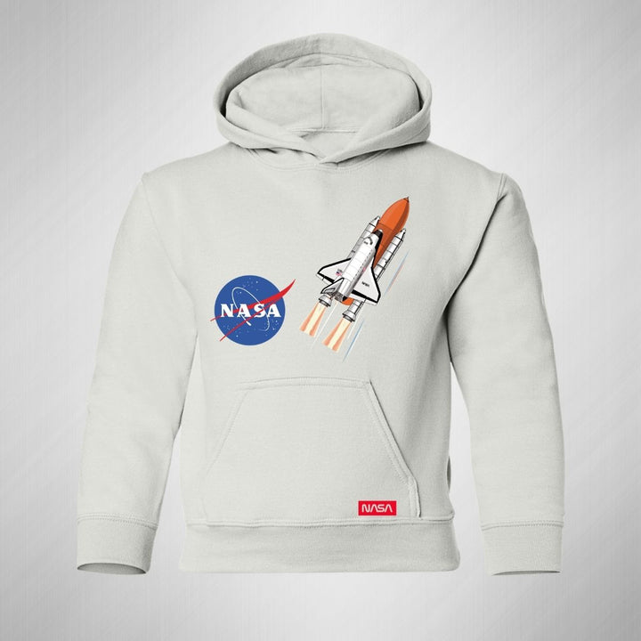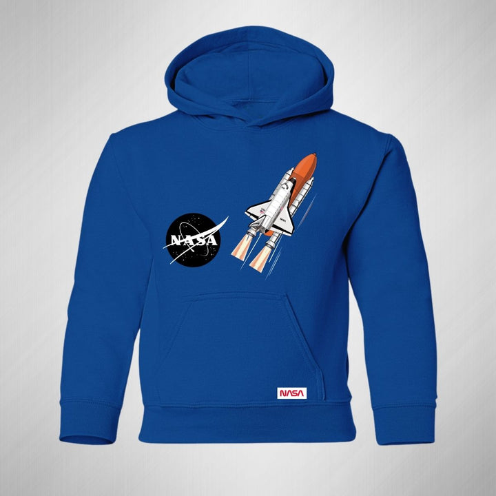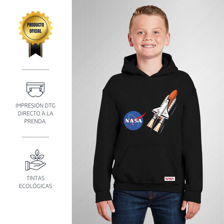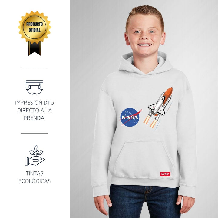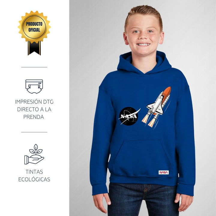 Sudadera hoodie infantil con gorro o capucha y bolsillo frontal canguro nueva, para niño o niña, diseño Transbordador original impreso con tecnología DTG (directo a la prenda) tacto cero, uso casual o deportiva, 50% algodón y 50% poliéster fleece pre encogido, estructura tubular con ajuste clásico. Colores de sudadera: Azul Rey, Blanco, Negro.