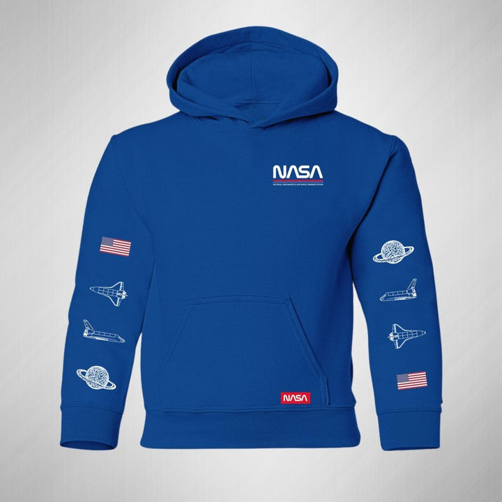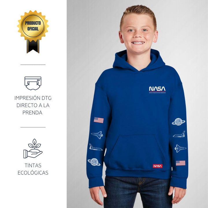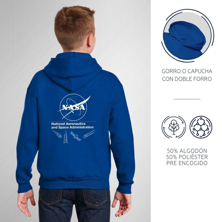 Sudadera hoodie infantil con gorro o capucha y bolsillo frontal canguro nueva, para niño o niña, diseño National Aeronautics original impreso con tecnología DTG (directo a la prenda) tacto cero, uso casual o deportiva, 50% algodón y 50% poliéster fleece pre encogido, estructura tubular con ajuste clásico. Colores de sudadera: Azul Rey, Blanco, Negro.
