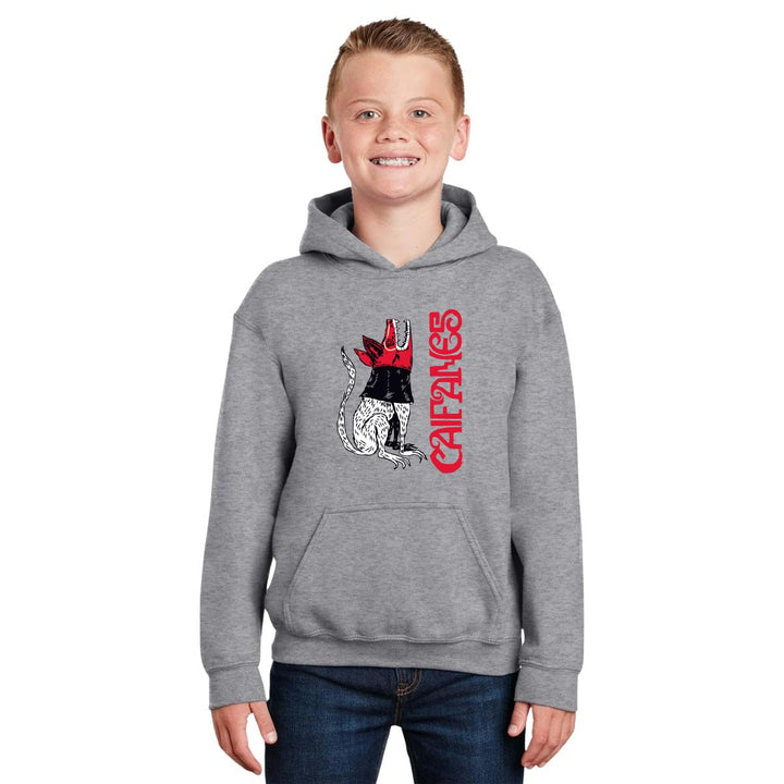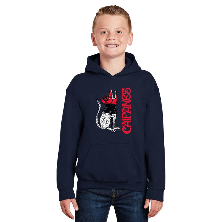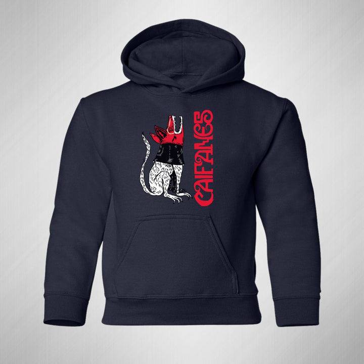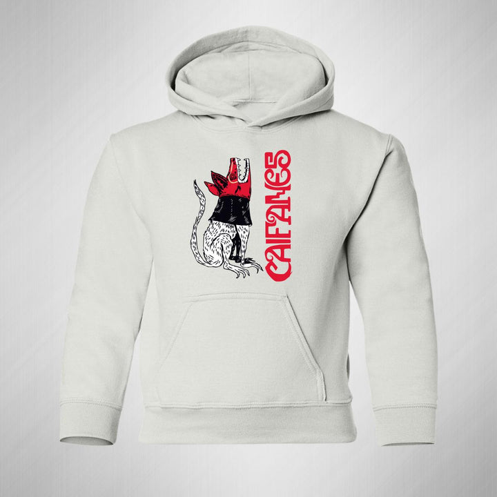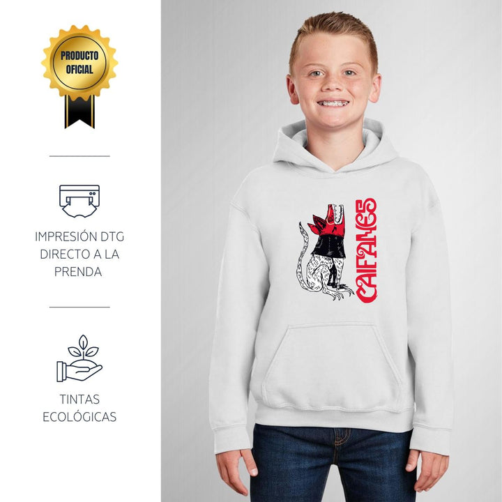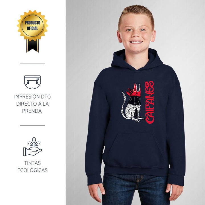 Sudadera hoodie infantil con gorro o capucha y bolsillo frontal canguro nueva, para niño o niña, diseño Rock Caifanes Logo original impreso con tecnología DTG (directo a la prenda) tacto cero, uso casual o deportiva, 50% algodón y 50% poliéster fleece pre encogido, estructura tubular con ajuste clásico. Colores de sudadera: Negro, Blanco, Azul Marino, Gris.