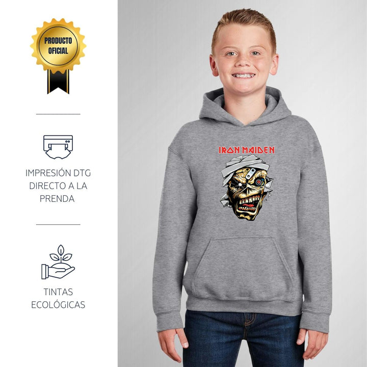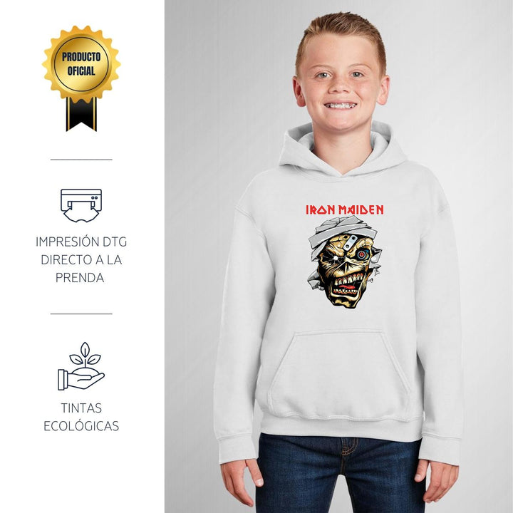 Sudadera hoodie infantil con gorro o capucha y bolsillo frontal canguro nueva, para niño o niña, diseño Rock Iron Maiden Póster original impreso con tecnología DTG (directo a la prenda) tacto cero, uso casual o deportiva, 50% algodón y 50% poliéster fleece pre encogido, estructura tubular con ajuste clásico. Colores de sudadera: Negro, Blanco, Azul Marino, Gris.