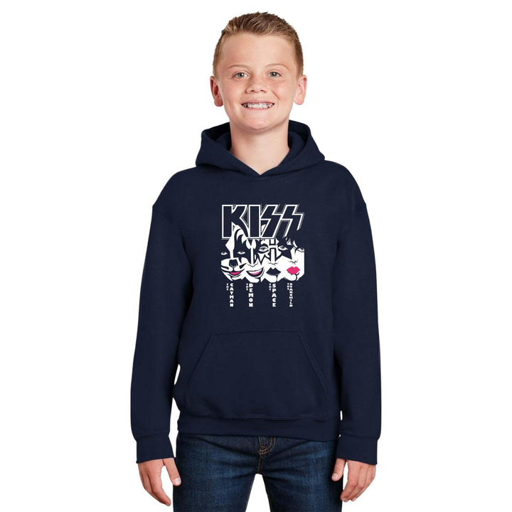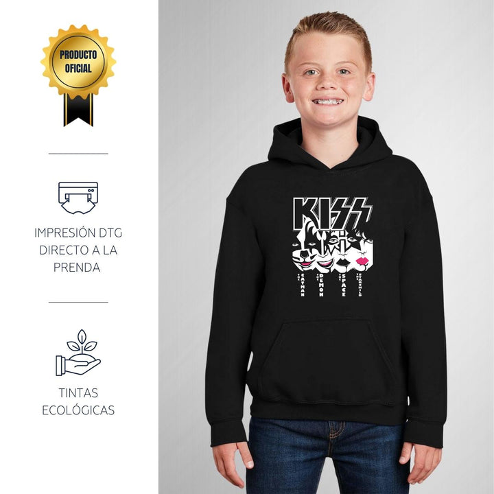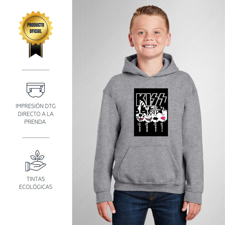 Sudadera hoodie infantil con gorro o capucha y bolsillo frontal canguro nueva, para niño o niña, diseño Rock Kiss Grupo original impreso con tecnología DTG (directo a la prenda) tacto cero, uso casual o deportiva, 50% algodón y 50% poliéster fleece pre encogido, estructura tubular con ajuste clásico. Colores de sudadera: Negro, Blanco, Azul Marino, Gris.