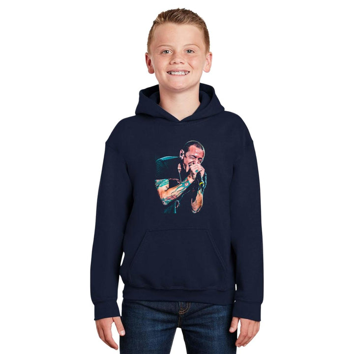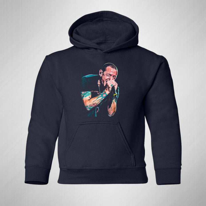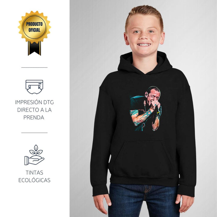 Sudadera hoodie infantil con gorro o capucha y bolsillo frontal canguro nueva, para niño o niña, diseño Rock Linkin Park Chester Bennington original impreso con tecnología DTG (directo a la prenda) tacto cero, uso casual o deportiva, 50% algodón y 50% poliéster fleece pre encogido, estructura tubular con ajuste clásico. Colores de sudadera: Negro, Azul Marino.