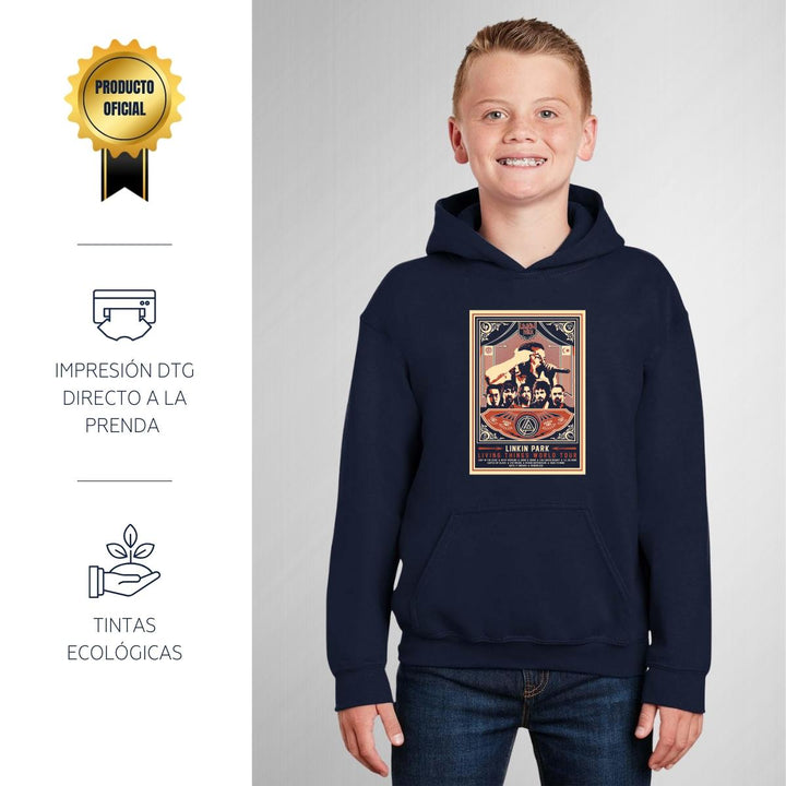 Sudadera hoodie infantil con gorro o capucha y bolsillo frontal canguro nueva, para niño o niña, diseño Rock Linkin Park Living Things original impreso con tecnología DTG (directo a la prenda) tacto cero, uso casual o deportiva, 50% algodón y 50% poliéster fleece pre encogido, estructura tubular con ajuste clásico. Colores de sudadera: Negro, Azul Marino.