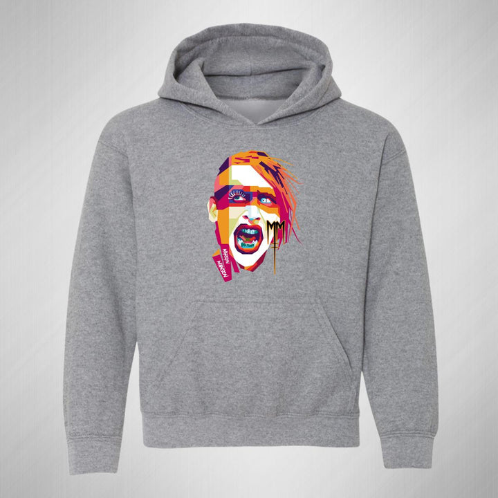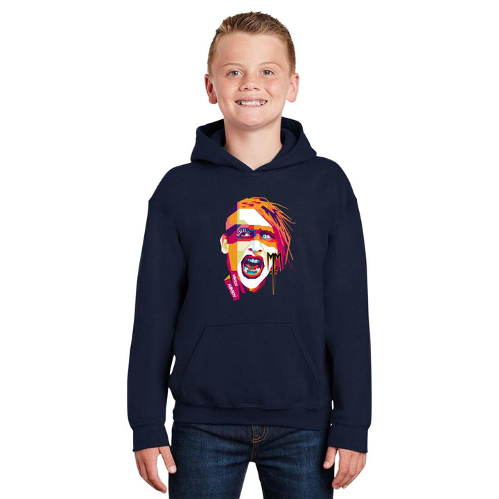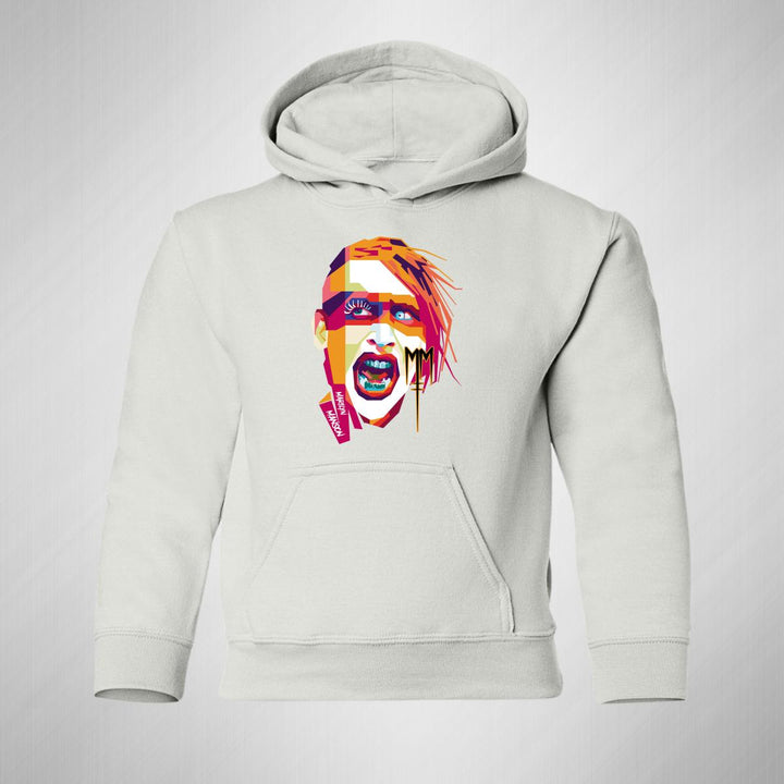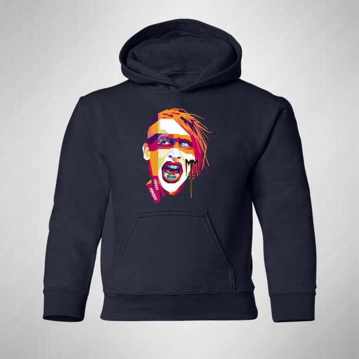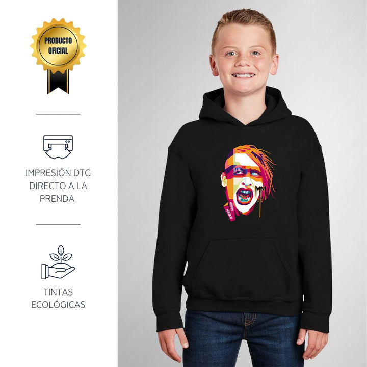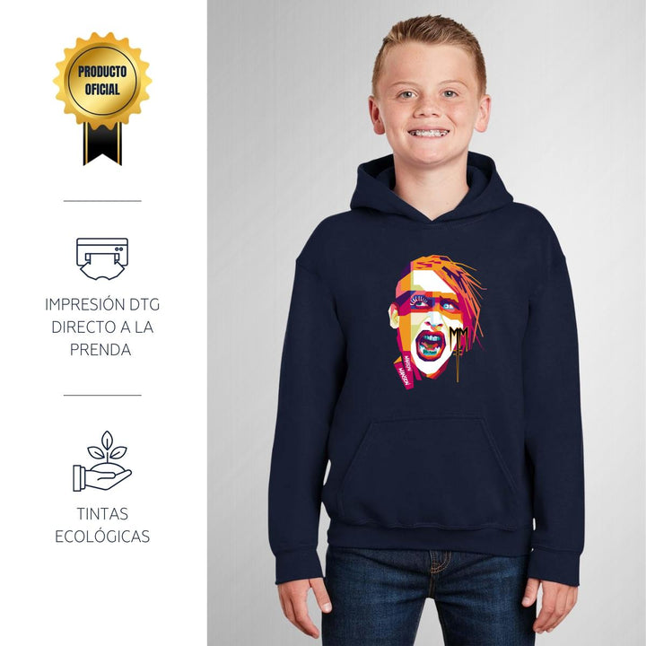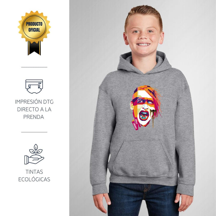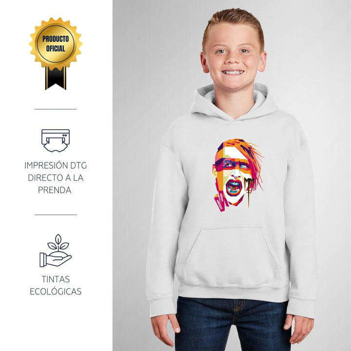 Sudadera hoodie infantil con gorro o capucha y bolsillo frontal canguro nueva, para niño o niña, diseño Rock Marilyn Manson Ilustración original impreso con tecnología DTG (directo a la prenda) tacto cero, uso casual o deportiva, 50% algodón y 50% poliéster fleece pre encogido, estructura tubular con ajuste clásico. Colores de sudadera: Negro, Blanco, Azul Marino, Gris.