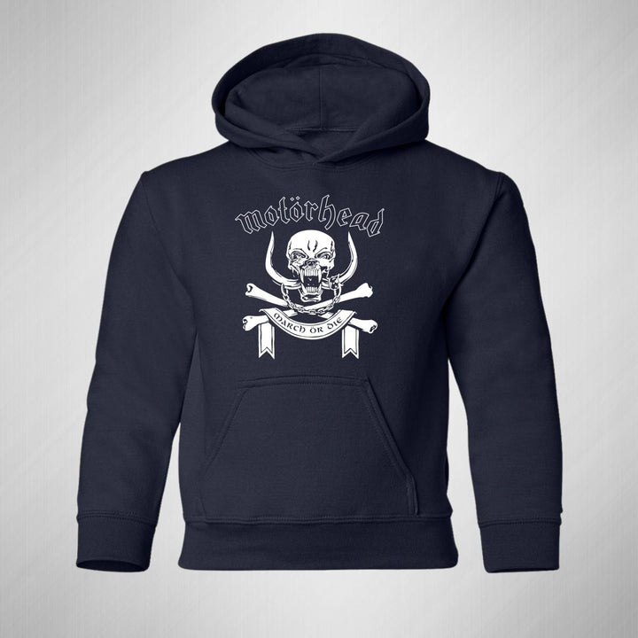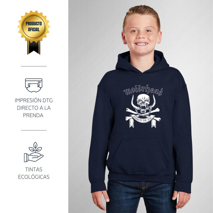 Sudadera hoodie infantil con gorro o capucha y bolsillo frontal canguro nueva, para niño o niña, diseño Rock Motorhead March or die original impreso con tecnología DTG (directo a la prenda) tacto cero, uso casual o deportiva, 50% algodón y 50% poliéster fleece pre encogido, estructura tubular con ajuste clásico. Colores de sudadera: Negro, Blanco, Azul Marino, Gris.