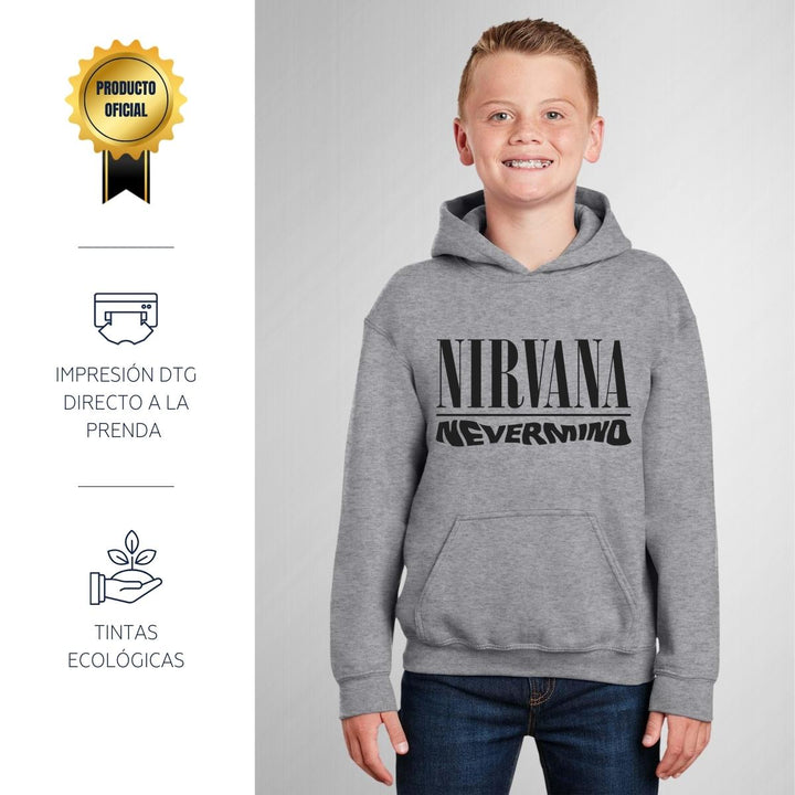 Sudadera hoodie infantil con gorro o capucha y bolsillo frontal canguro nueva, para niño o niña, diseño Rock Nirvana Nevermind original impreso con tecnología DTG (directo a la prenda) tacto cero, uso casual o deportiva, 50% algodón y 50% poliéster fleece pre encogido, estructura tubular con ajuste clásico. Colores de sudadera: Blanco, Gris.