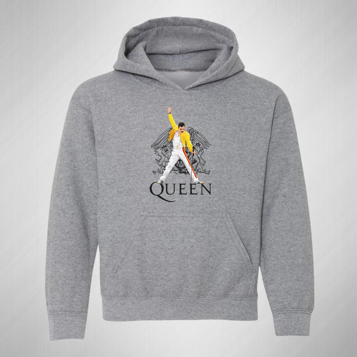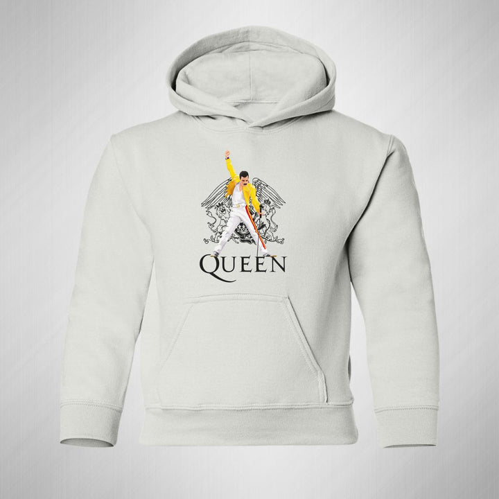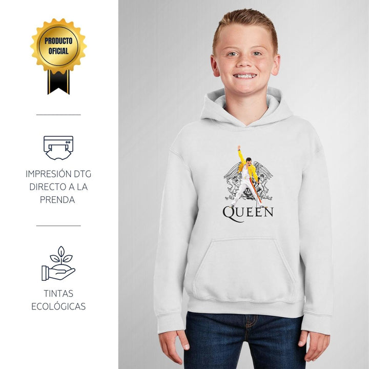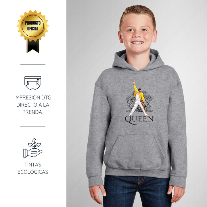 Sudadera hoodie infantil con gorro o capucha y bolsillo frontal canguro nueva, para niño o niña, diseño Rock Queen Póster original impreso con tecnología DTG (directo a la prenda) tacto cero, uso casual o deportiva, 50% algodón y 50% poliéster fleece pre encogido, estructura tubular con ajuste clásico. Colores de sudadera: Blanco, Gris.