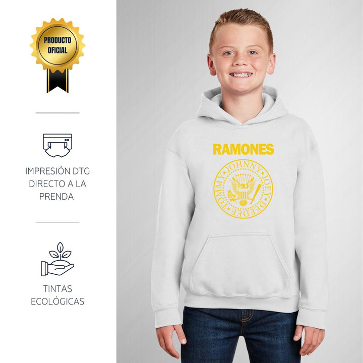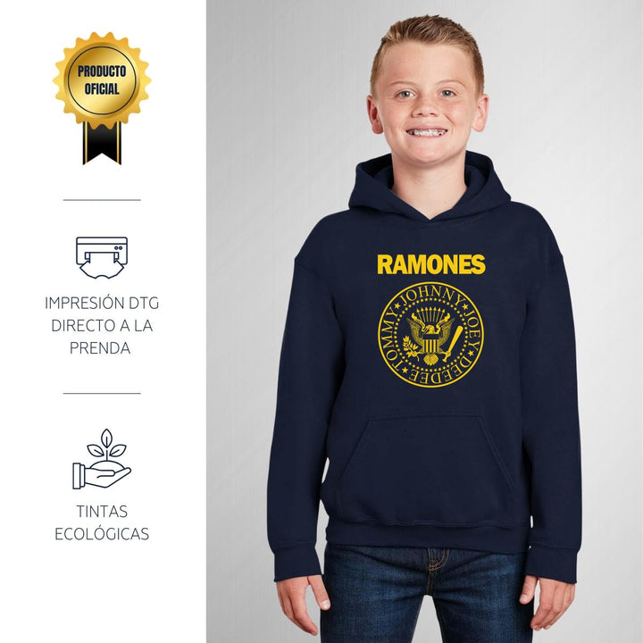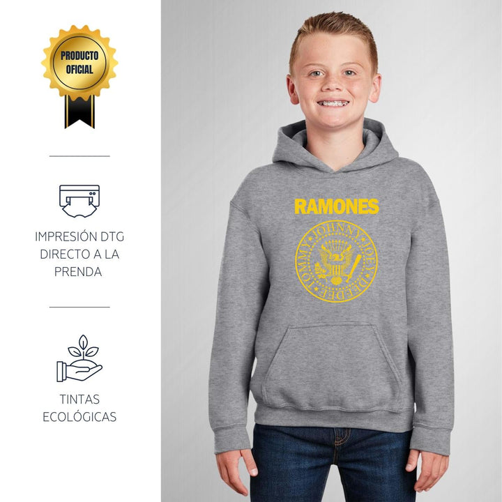 Sudadera hoodie infantil con gorro o capucha y bolsillo frontal canguro nueva, para niño o niña, diseño Rock Ramones Logo original impreso con tecnología DTG (directo a la prenda) tacto cero, uso casual o deportiva, 50% algodón y 50% poliéster fleece pre encogido, estructura tubular con ajuste clásico. Colores de sudadera: Negro, Blanco, Azul Marino, Gris.