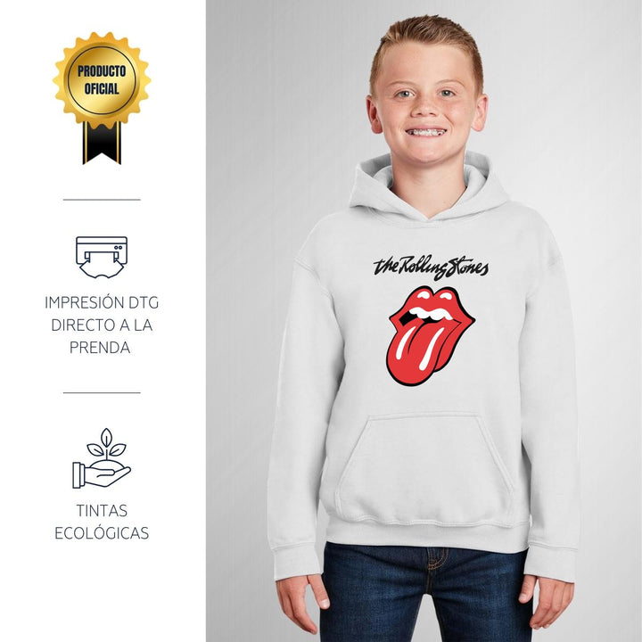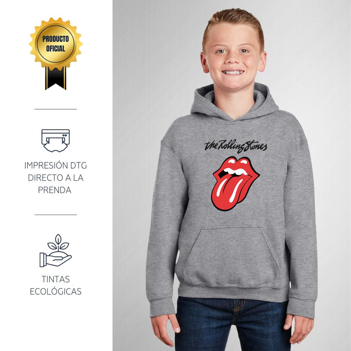 Sudadera hoodie infantil con gorro o capucha y bolsillo frontal canguro nueva, para niño o niña, diseño Rock The Rolling Stones Logo original impreso con tecnología DTG (directo a la prenda) tacto cero, uso casual o deportiva, 50% algodón y 50% poliéster fleece pre encogido, estructura tubular con ajuste clásico. Colores de sudadera: Blanco, Gris.