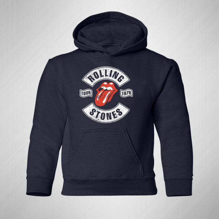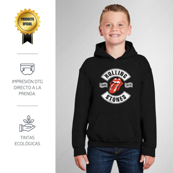 Sudadera hoodie infantil con gorro o capucha y bolsillo frontal canguro nueva, para niño o niña, diseño Rock The Rolling Stones Tour 1978 original impreso con tecnología DTG (directo a la prenda) tacto cero, uso casual o deportiva, 50% algodón y 50% poliéster fleece pre encogido, estructura tubular con ajuste clásico. Colores de sudadera: Negro, Azul Marino.