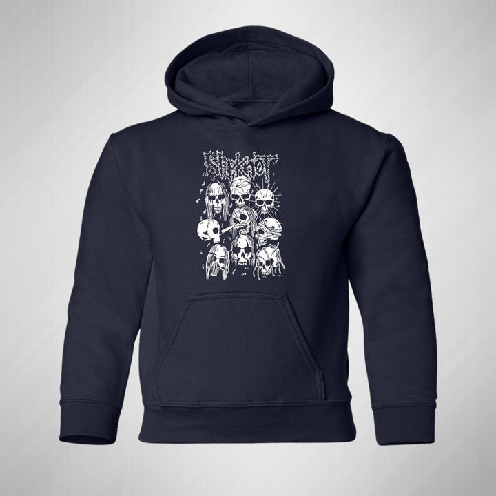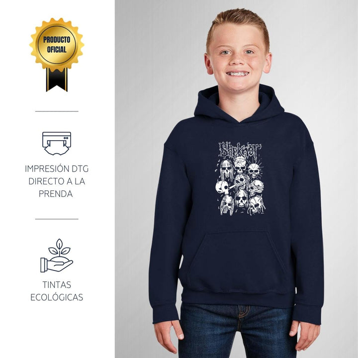 Sudadera hoodie infantil con gorro o capucha y bolsillo frontal canguro nueva, para niño o niña, diseño Rock Slipknot Calaveras original impreso con tecnología DTG (directo a la prenda) tacto cero, uso casual o deportiva, 50% algodón y 50% poliéster fleece pre encogido, estructura tubular con ajuste clásico. Colores de sudadera: Negro, Blanco, Azul Marino, Gris.