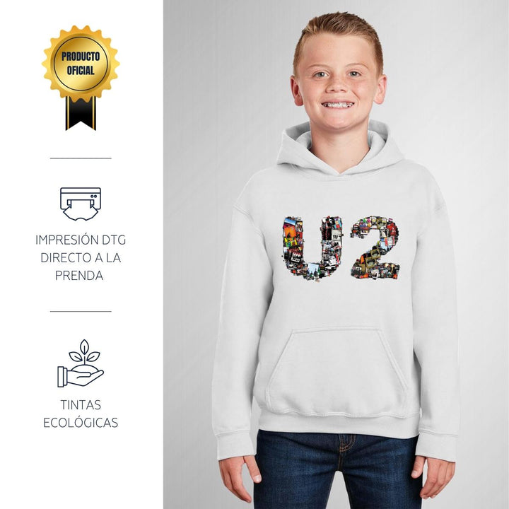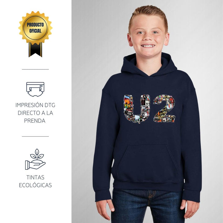 Sudadera hoodie infantil con gorro o capucha y bolsillo frontal canguro nueva, para niño o niña, diseño Rock U2 Portadas Discos original impreso con tecnología DTG (directo a la prenda) tacto cero, uso casual o deportiva, 50% algodón y 50% poliéster fleece pre encogido, estructura tubular con ajuste clásico. Colores de sudadera: Negro, Blanco, Azul Marino, Gris.