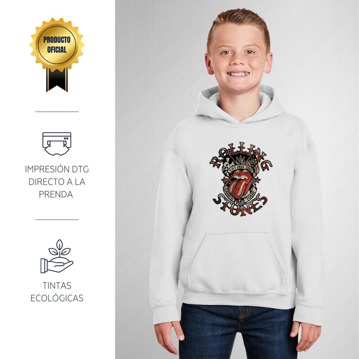 Sudadera hoodie infantil con gorro o capucha y bolsillo frontal canguro nueva, para niño o niña, diseño Rock The Rolling Stones Tattoo You original impreso con tecnología DTG (directo a la prenda) tacto cero, uso casual o deportiva, 50% algodón y 50% poliéster fleece pre encogido, estructura tubular con ajuste clásico. Colores de sudadera: Negro, Blanco, Azul Marino, Gris.