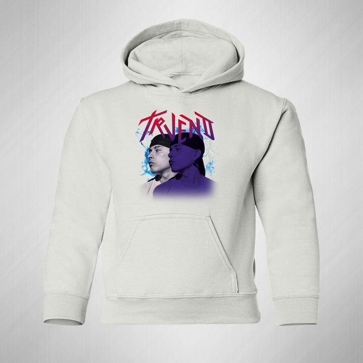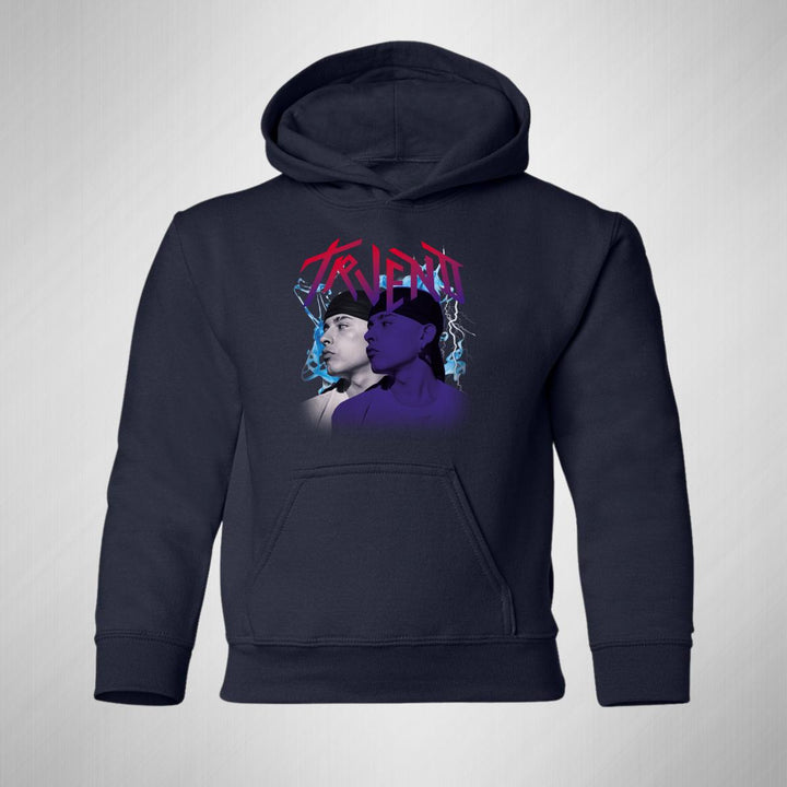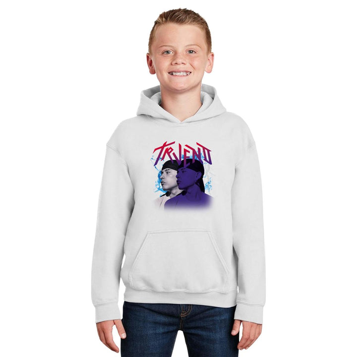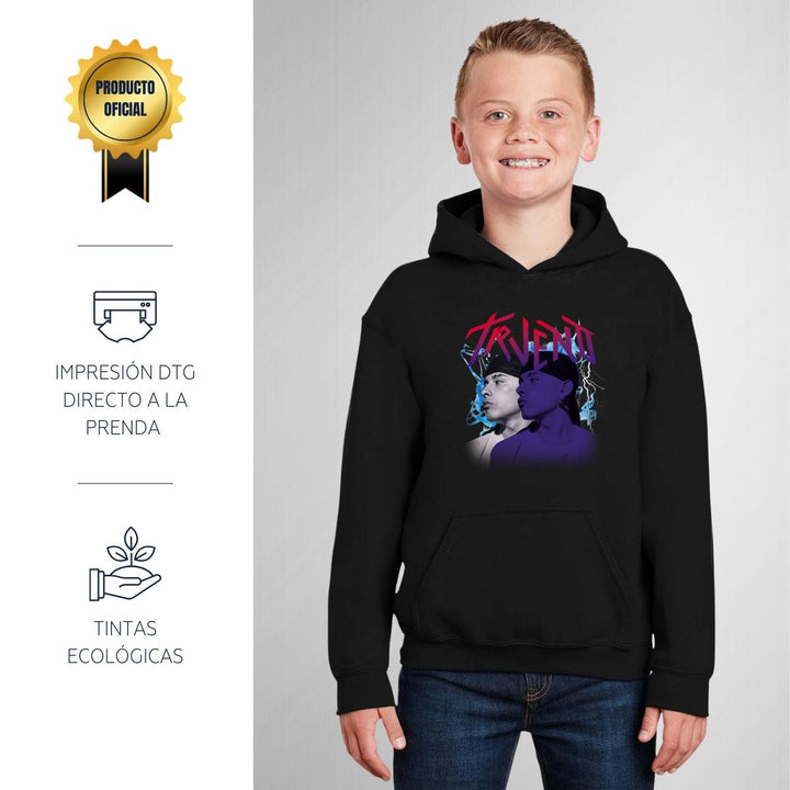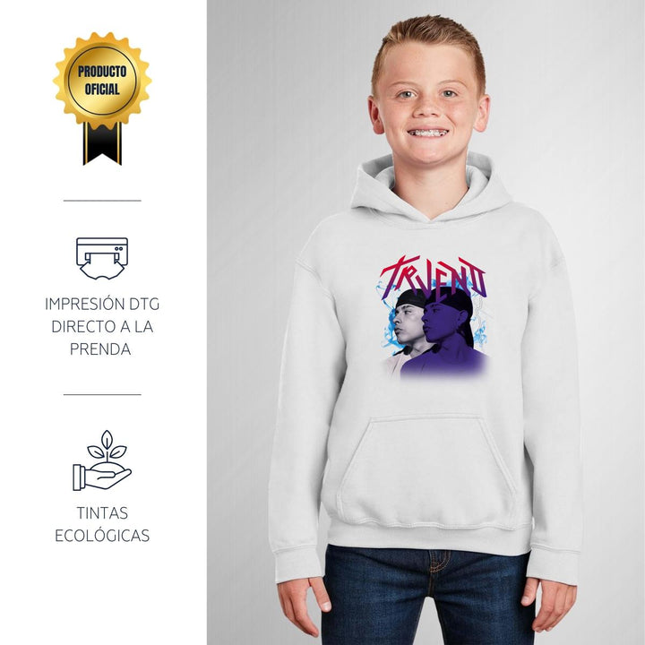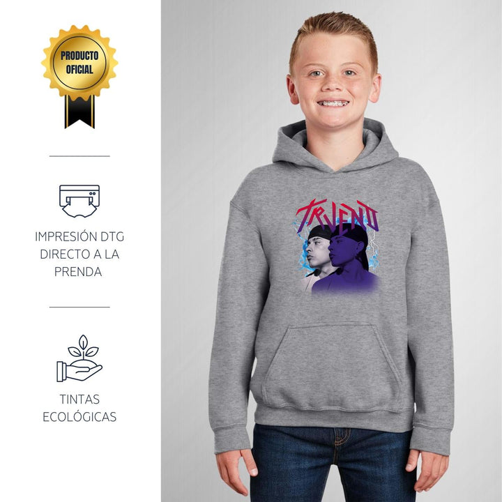 Sudadera hoodie infantil con gorro o capucha y bolsillo frontal canguro nueva, para niño o niña, diseño Trueno Rapero Rap original impreso con tecnología DTG (directo a la prenda) tacto cero, uso casual o deportiva, 50% algodón y 50% poliéster fleece pre encogido, estructura tubular con ajuste clásico. Colores de sudadera: Negro, Blanco, Azul Marino, Gris.
