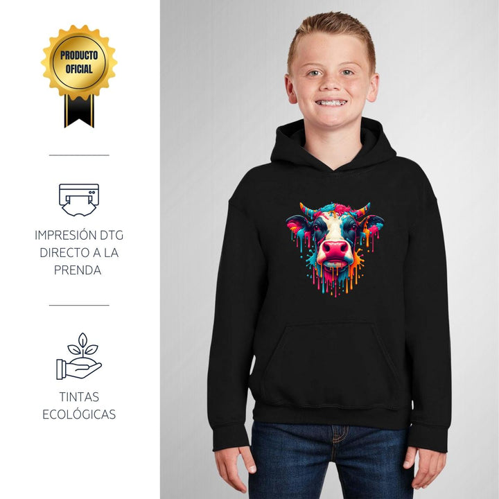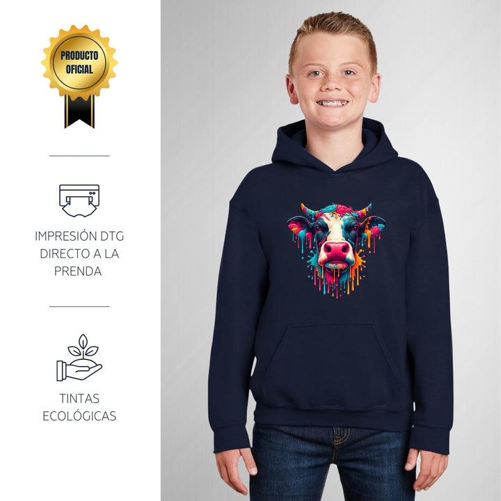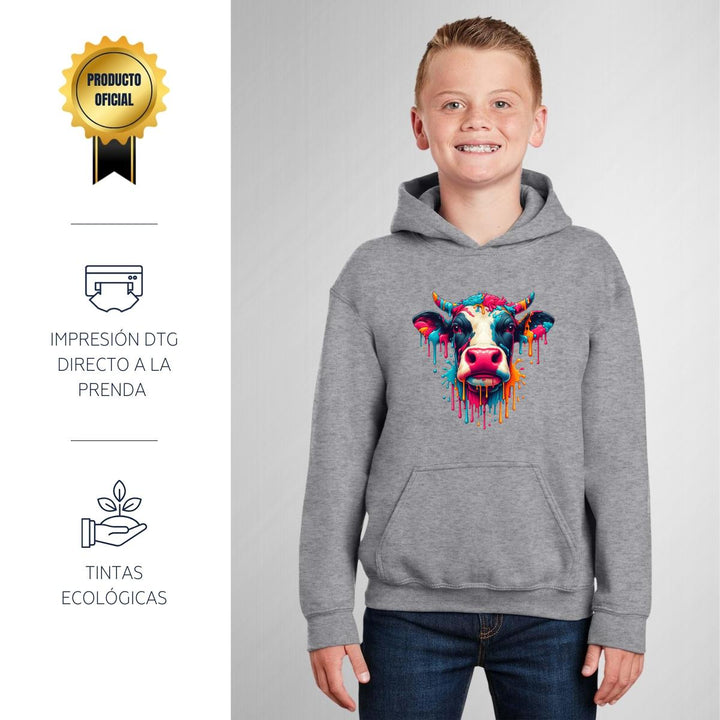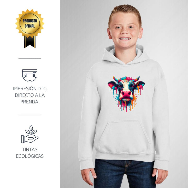 Sudadera hoodie infantil con gorro o capucha y bolsillo frontal canguro nueva, para niño o niña, diseño Vaca Psicodélico original impreso con tecnología DTG (directo a la prenda) tacto cero, uso casual o deportiva, 50% algodón y 50% poliéster fleece pre encogido, estructura tubular con ajuste clásico. Colores de sudadera: Negro, Blanco, Azul Marino, Gris.