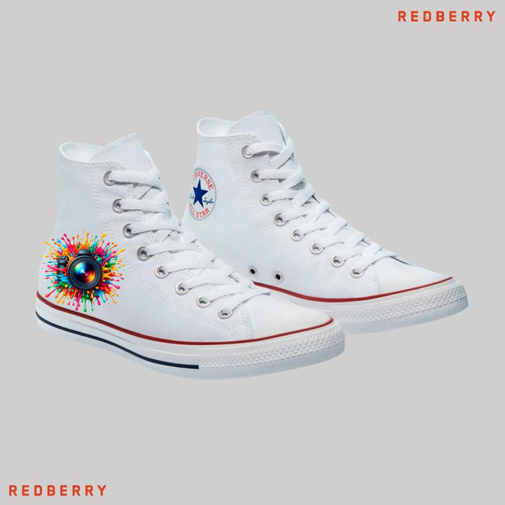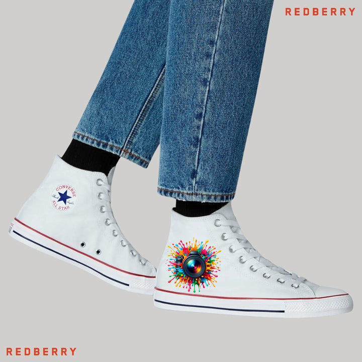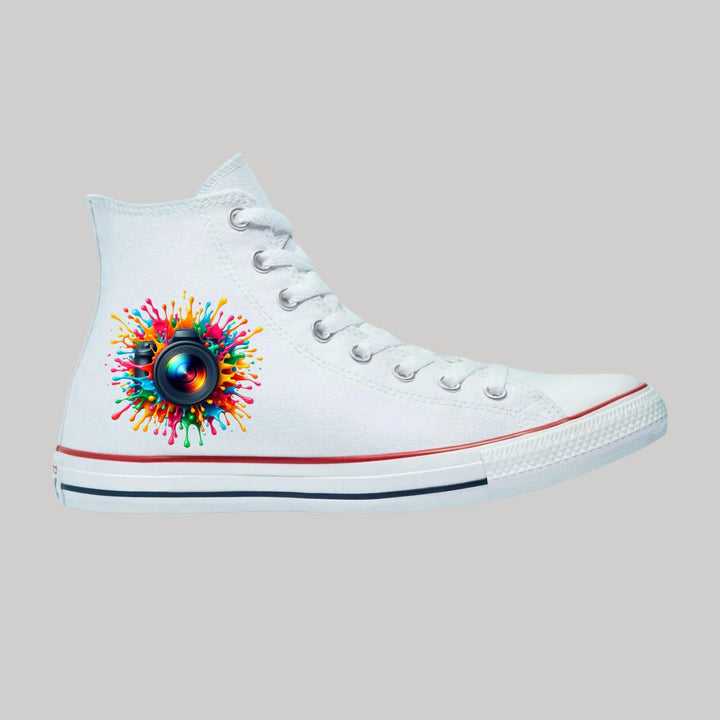 Tenis Converse Chuck Taylor All-Star originales, para hombre o mujer, nuevos con diseño Cámara Fotografía Photography Camera impreso con tecnología DTG (directo a la prenda) tacto cero, material lona, suela sintética antiderrapante. Color: Blanco.