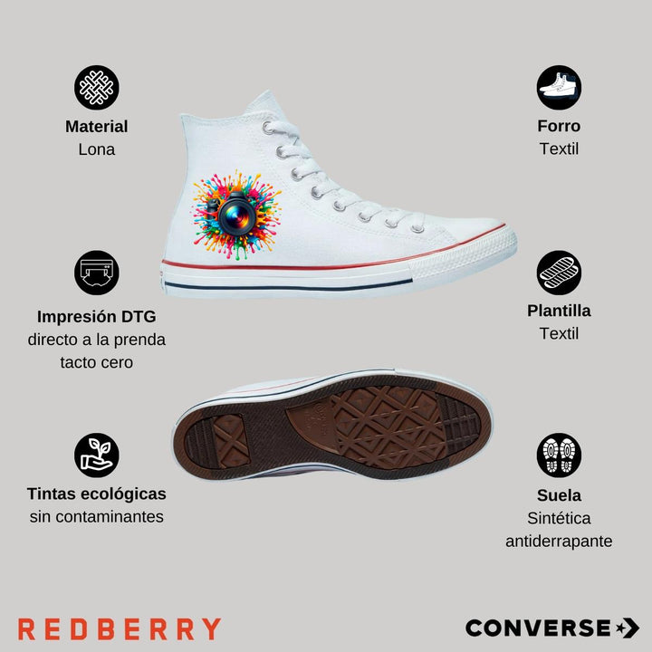 ORIGINALIDAD Y SOSTENIBILIDAD: Tenis Converse Chuck Taylor All-Star de bota originales, nuevos con diseño Cámara Fotografía Photography Camera impreso con tecnología DTG (directo a la prenda) tacto cero. Se utilizan tintas ecológicas sin contaminantes que se adhieren a las fibras de la prenda, garantizando calidad, colores vivos e imagen de larga duración en el tenis sin comprometer el planeta.