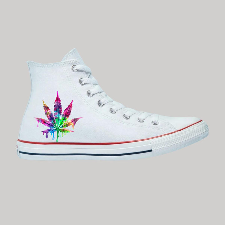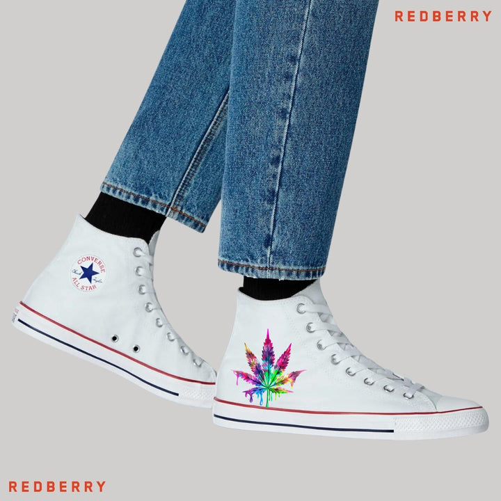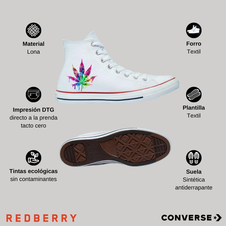 Tenis Converse Chuck Taylor All-Star originales, para hombre o mujer, nuevos con diseño Cannabis impreso con tecnología DTG (directo a la prenda) tacto cero, material lona, suela sintética antiderrapante. Color: Blanco.