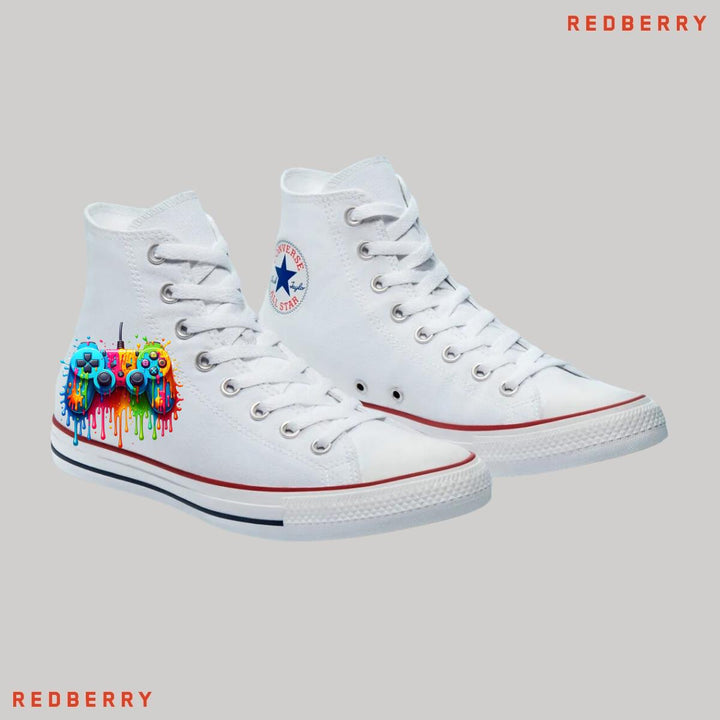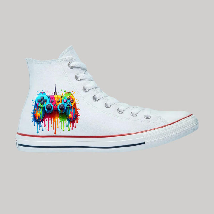 Tenis Converse Chuck Taylor All-Star originales, para hombre o mujer, nuevos con diseño Gaming Gamer impreso con tecnología DTG (directo a la prenda) tacto cero, material lona, suela sintética antiderrapante. Color: Blanco.