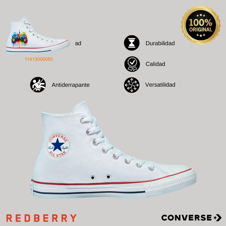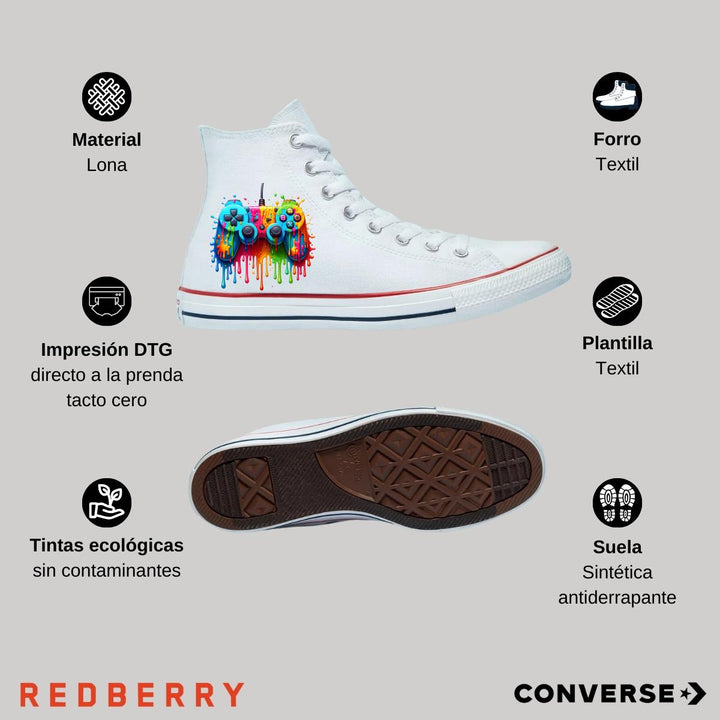 - ORIGINALIDAD Y SOSTENIBILIDAD: Tenis Converse Chuck Taylor All-Star de bota originales, nuevos con diseño Gaming Gamer impreso con tecnología DTG (directo a la prenda) tacto cero. Se utilizan tintas ecológicas sin contaminantes que se adhieren a las fibras de la prenda, garantizando calidad, colores vivos e imagen de larga duración en el tenis sin comprometer el planeta.