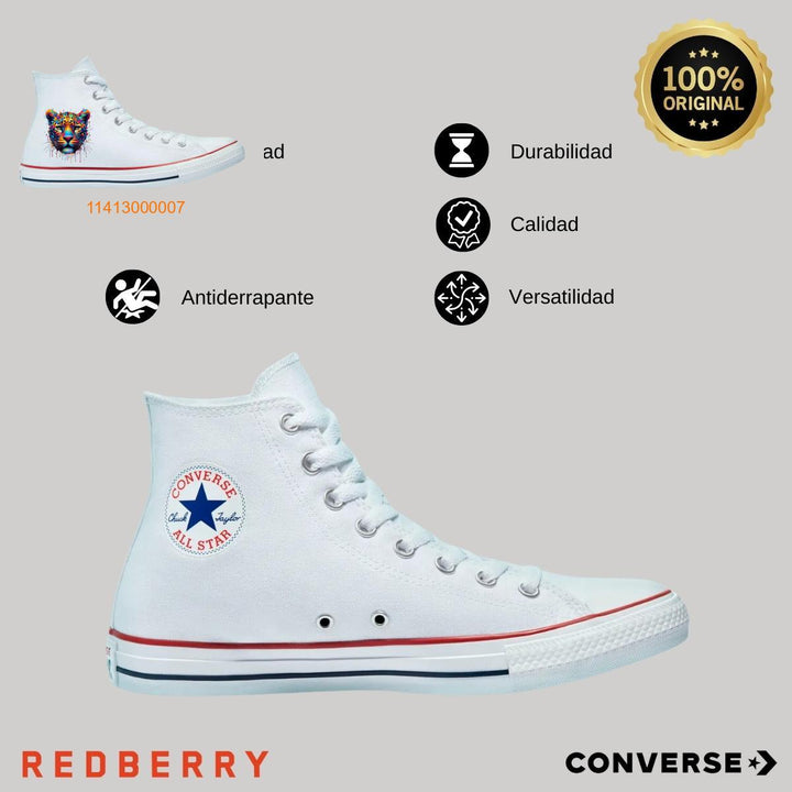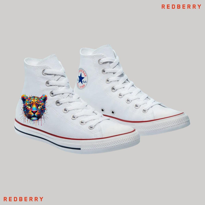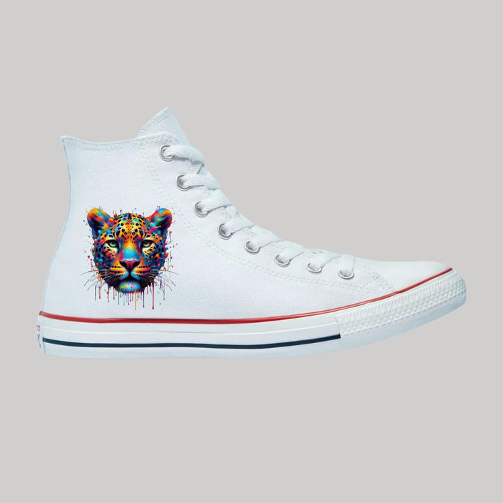 Tenis Converse Chuck Taylor All-Star originales, para hombre o mujer, nuevos con diseño Jaguar Feline Felino impreso con tecnología DTG (directo a la prenda) tacto cero, material lona, suela sintética antiderrapante. Color: Blanco.