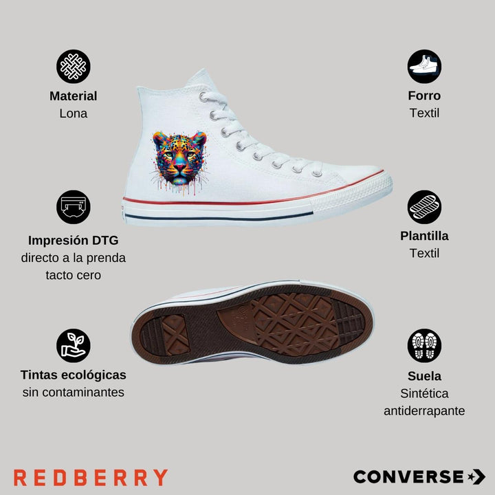 - ORIGINALIDAD Y SOSTENIBILIDAD: Tenis Converse Chuck Taylor All-Star de bota originales, nuevos con diseño Jaguar Feline Felino impreso con tecnología DTG (directo a la prenda) tacto cero. Se utilizan tintas ecológicas sin contaminantes que se adhieren a las fibras de la prenda, garantizando calidad, colores vivos e imagen de larga duración en el tenis sin comprometer el planeta.