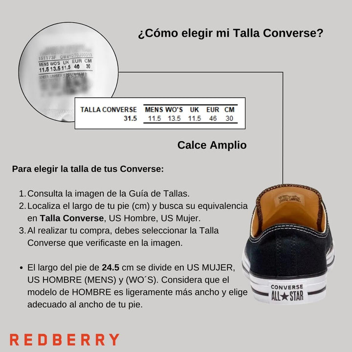 Si su largo de pie es de 25 cm deberá escoger la talla 6.5 US Hombre o 8.5 US Mujer del menú desplegable (Talla del Converse 26.5 MX).