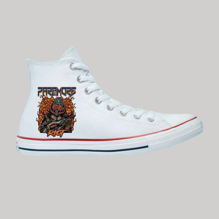Tenis Converse Chuck Taylor All-Star originales, para hombre o mujer, nuevos con diseño Paramore Ilustración impreso con tecnología DTG (directo a la prenda) tacto cero, material lona, suela sintética antiderrapante. Color: Blanco.