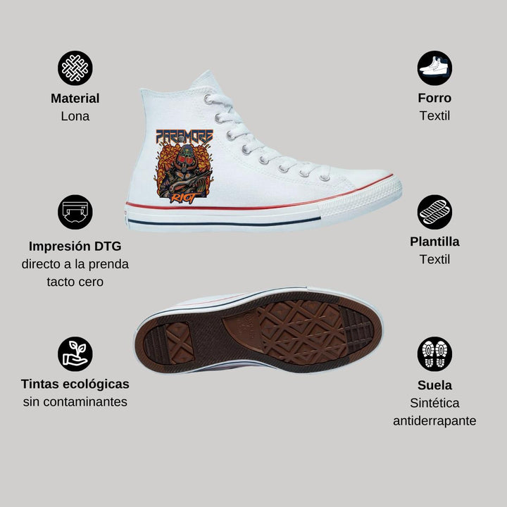 - ORIGINALIDAD Y SOSTENIBILIDAD: Tenis Converse Chuck Taylor All-Star de bota originales, nuevos con diseño Paramore Ilustración impreso con tecnología DTG (directo a la prenda) tacto cero. Se utilizan tintas ecológicas sin contaminantes que se adhieren a las fibras de la prenda, garantizando calidad, colores vivos e imagen de larga duración en el tenis sin comprometer el planeta.