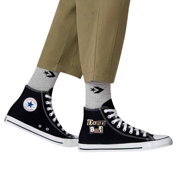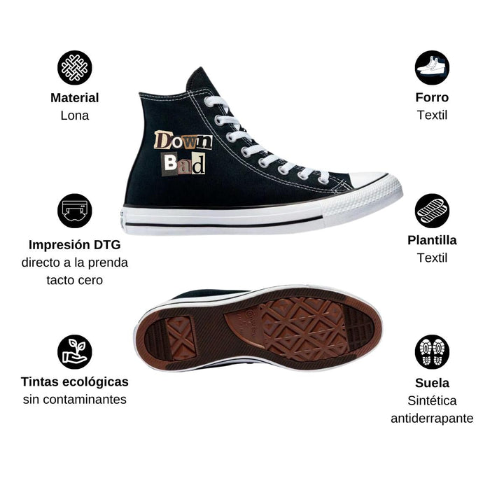 - ORIGINALIDAD Y SOSTENIBILIDAD: Tenis Converse Chuck Taylor All-Star de bota originales, nuevos con diseño Taylor Swift Bad impreso con tecnología DTG (directo a la prenda) tacto cero. Se utilizan tintas ecológicas sin contaminantes que se adhieren a las fibras de la prenda, garantizando calidad, colores vivos e imagen de larga duración en el tenis sin comprometer el planeta.