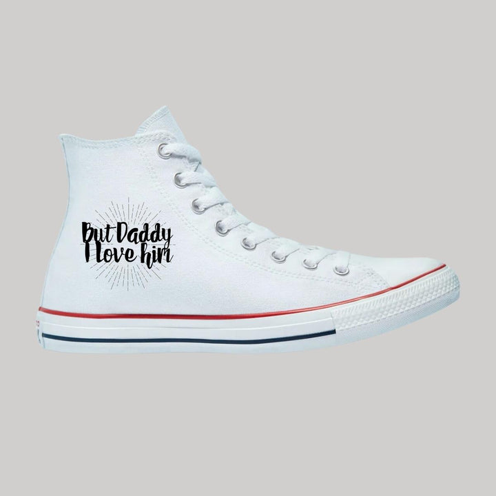 Tenis Converse Chuck Taylor All-Star originales, para hombre o mujer, nuevos con diseño Taylor Swift I love him impreso con tecnología DTG (directo a la prenda) tacto cero, material lona, suela sintética antiderrapante. Color: Blanco.