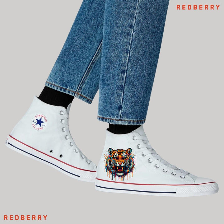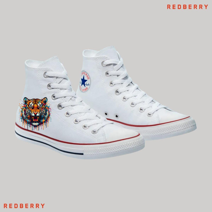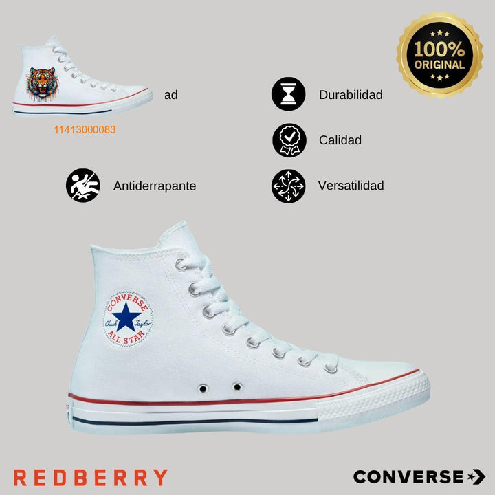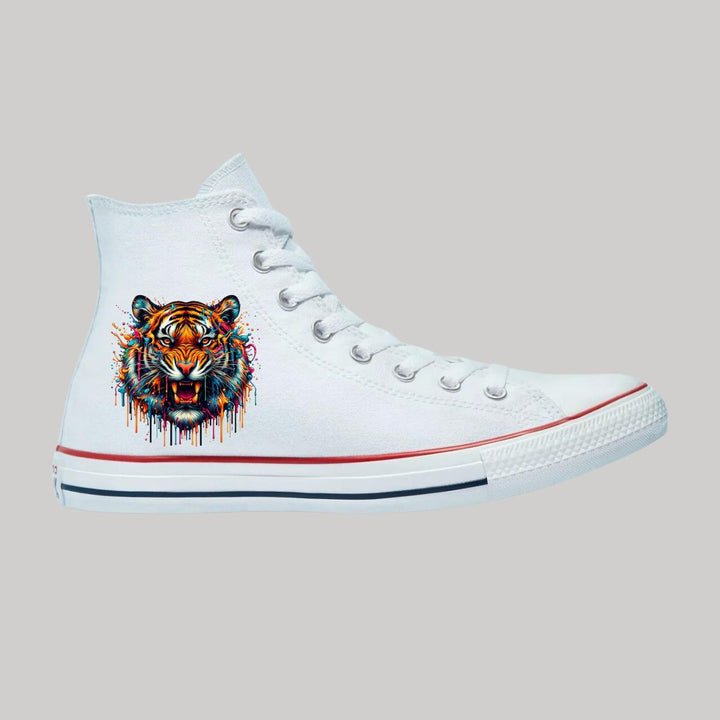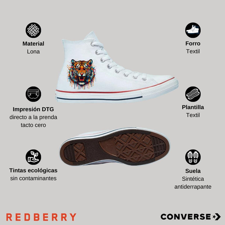 Tenis Converse Chuck Taylor All-Star originales, para hombre o mujer, nuevos con diseño Tigre Tiger Felino Feline impreso con tecnología DTG (directo a la prenda) tacto cero, material lona, suela sintética antiderrapante. Color: Blanco.