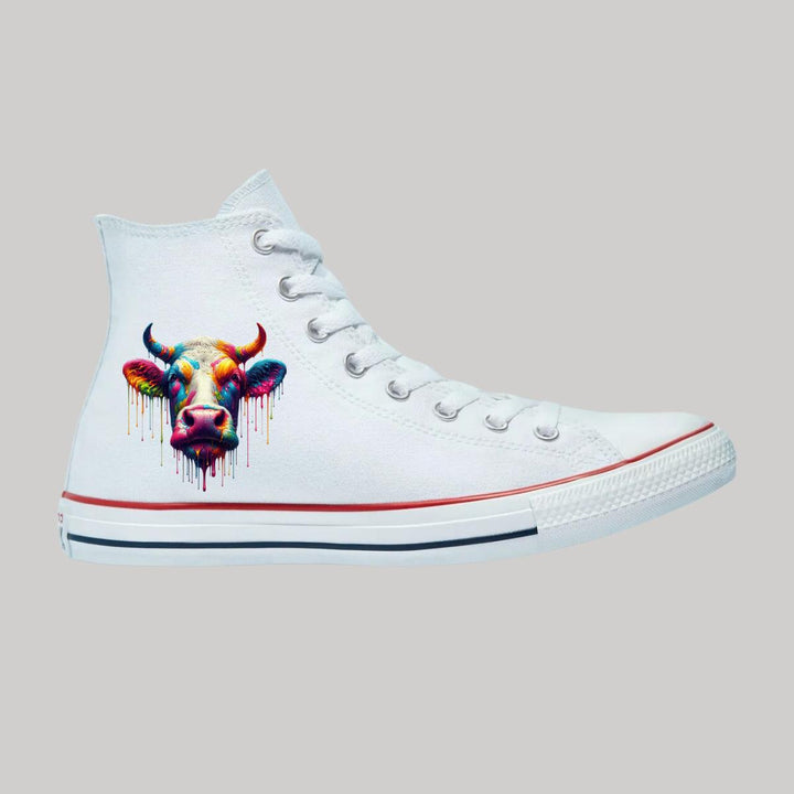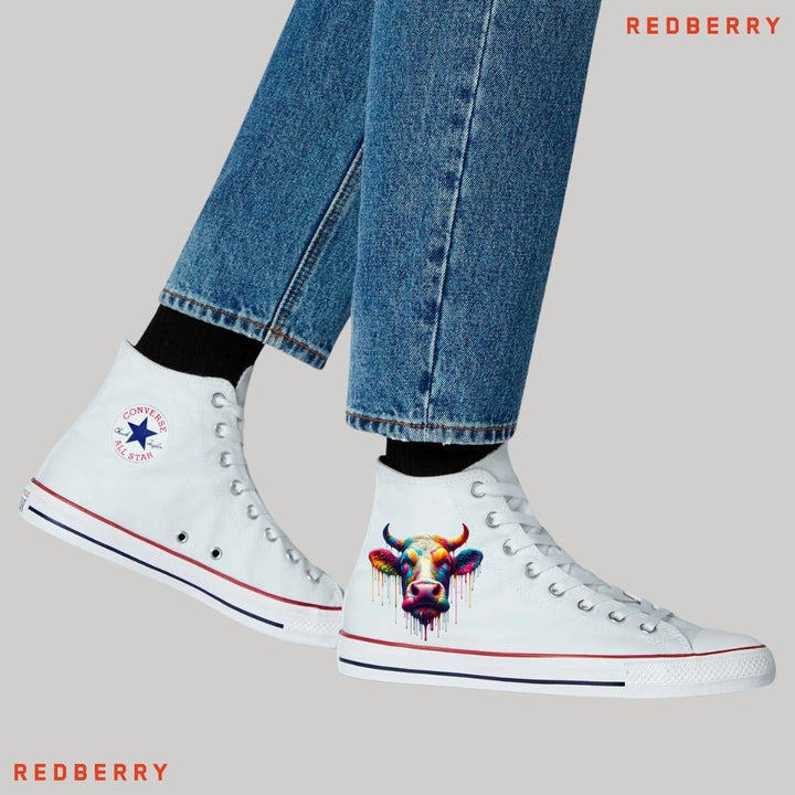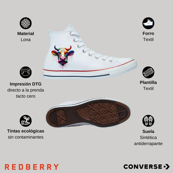 - ORIGINALIDAD Y SOSTENIBILIDAD: Tenis Converse Chuck Taylor All-Star de bota originales, nuevos con diseño Vaca Cow impreso con tecnología DTG (directo a la prenda) tacto cero. Se utilizan tintas ecológicas sin contaminantes que se adhieren a las fibras de la prenda, garantizando calidad, colores vivos e imagen de larga duración en el tenis sin comprometer el planeta.